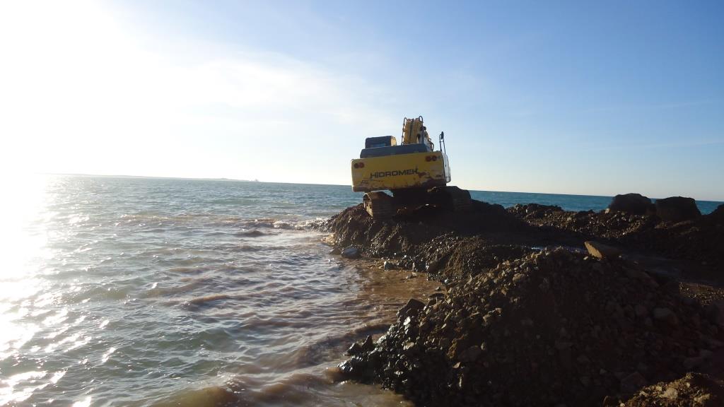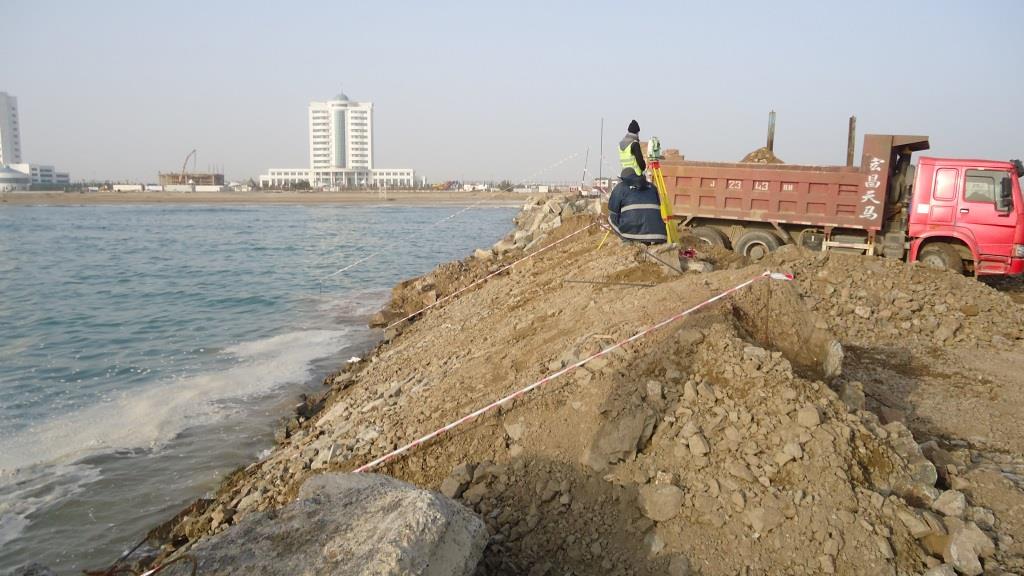 Öncelikle bu dalgakırana ait biraz bilgi vermek istiyorum. Türkmenistan Awaza bölgesinde inşa etmiş olduğumuz bu dalgakıran, Hazar Gölü’nde ve 570 m uzunluğundadır. 0-200 kg Kum-Çakıl karışımı çekirdek dolgusu, 50 cm kalınlıkta 50-200 kg çakıl karışımı taş şilte ve liman tarafında 0,4-1 ton karışımı taş şev kaplama, açık deniz tarafında 1,15×1,15×1,15 ebatlarında küp beton bloklar ile korunacak şekilde toplam 3 tabakadan oluşmaktadır. 1,15×1,15×1,15 ebatlarındaki beton bloklar deniz suyuna dayanıklı sülfatlı çimento içermektedir. Çekirdek dolgu malzemesini korumak amacı ile, örgülü geotekstil filtre bezi kullanılmıştır. Dalgakıran imalatından sonra, proje kapsamında dalgakıranın kafa kısmına kafe yapılması öngörülmüş ve kafa kesiti geniş tasarlanmıştır. Daha sonra bu kısma kazıklı temel üzerine çelik konstrüksiyon kafe yapılmış ve kafeye ulaşım için dalgakıran üzerine asfalt yapılmıştır. Bu ilginç yapının da tüm aşamalarını başka bir yazımda anlatacağım.