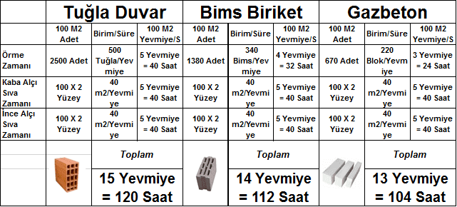 Yukarıdaki resimde 3 öncü duvar malzemesinin yaklaşık adamsaat değerlerini görebilirsiniz. Bu tabloya göre işçilik maliyeti olarak gazbeton>bims>tuğla diyebiliriz.