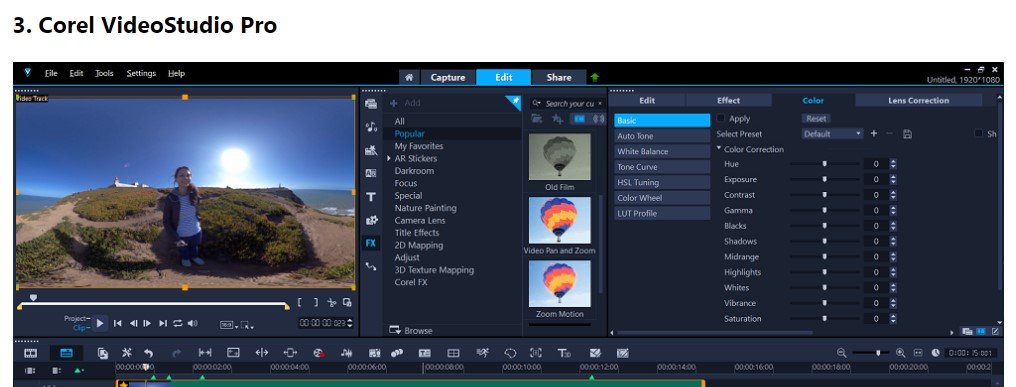 Temel kırpma ve kırpma araçlarının yanı sıra VideoStudio Pro, 360 derece düzenleme, lens düzeltme, akıllı proxy düzenleme, renk anahtarı/yeşil ekran araçları ve daha fazlası gibi çeşitli özellikler sunar.